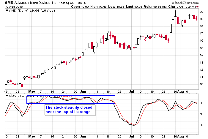 AMD trended up May and the first half of June. The Stochastic confirmed the trend by rolling up and down in overbought territory.