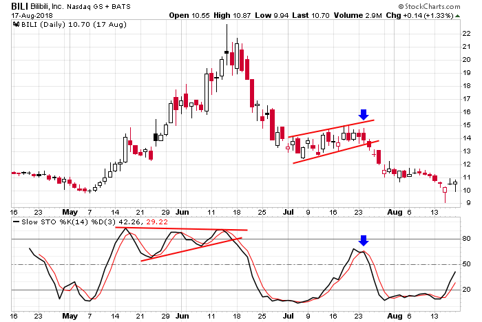 BILI broke down in June and then formed a bearish flag pattern in July. During this time, the Stochastic cycled up and then rolled over. It got passed its center line but couldn’t make it to overbought territory. It didn’t matter. Once the indicator rolled over, the stock’s newly formed downtrend resumed.
