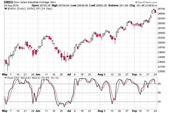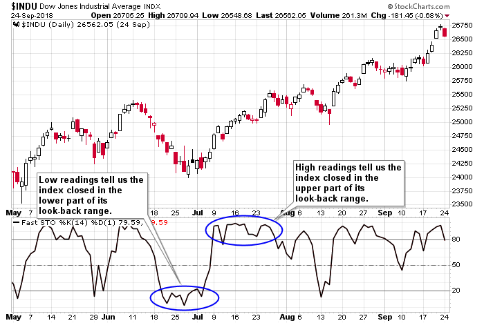 Here’s is the Dow daily with a Fast Stochastic (14). This means a 14-day period is used as the look-back period. The highest high and lowest low of this period is used in the calculation. Low readings tell us the index closed near the bottom of its 14-day range while higher readings tell us the opposite, that the index closed in the upper part of its range.
