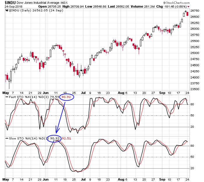 Same Dow chart, except both a Fast and Slow Stochastic are displayed. Notice the %D of the Fast Stochastic is the %K of the Slow Stochastic.