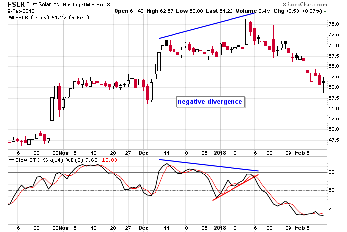 FSLR was moving up, but it wasn’t an incredibly strong stock. The higher high in January coincided with a lower high by the Stochastic, and after the indicator broke a support level (shown in red), the stock rolled over and gave back a chunk of its gains.