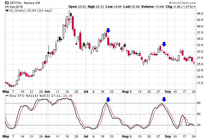 IQ broke down in June. Then, while the stock trended down, each time the Stochastic cycled up to an overbought level near 80, aggressive traders were given short signals.