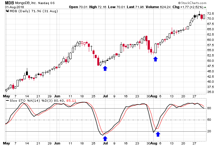 MDB was a strong stock in a steady uptrend. Twice it dipped near term within its overall trend, and each time an oversold Stochastic reading helped time a “buy the dip” entry.