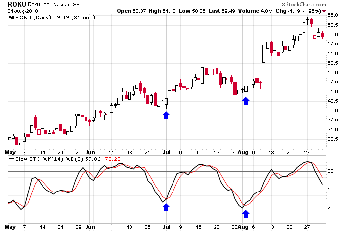 ROKU wasn’t an extremely smooth-moving stock, but buyable dips within its overall uptrend were identified when the Stochastic dropped near 20 and then started to rebound.