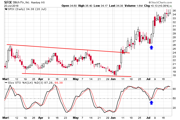 SFIX broke out of a multi-month base and rallied from the mid 20’s to about 30. It’s Stochastic fell from overbought territory and cycle down to its center line, where if found support and curled up. Classic dip within a newly formed uptrend.