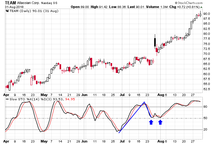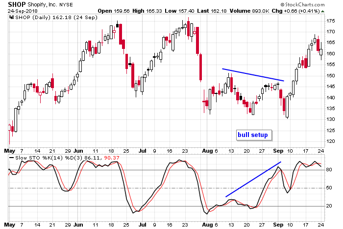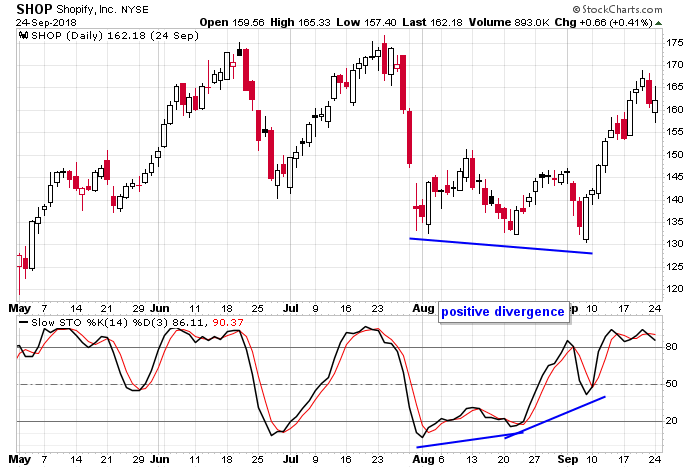 In late-August of the SHOP chart shown, the stock put in a lower low, but the Stochastic registered an obvious higher low and got all the way to overbought territory. This was a sign that despite the stock struggling a little, strength was building. It told us weakness from there was likely to get bought up. The next dip was relatively brief, and the stock surged off its low.