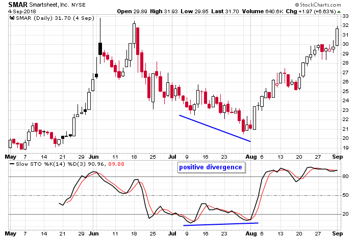 SMAR grinded down during July and formed a positive divergence with it Stochastic, which couldn’t take out its previous low. As a bound indicator, the Stochastic can only fall so far, regardless of how weak a stock is. Because of this, look for confirmation elsewhere. Wait for the %K line to cross the %D line or for it to cross back above 20. In this case, the stock based for 3 days and then jumped 10%.