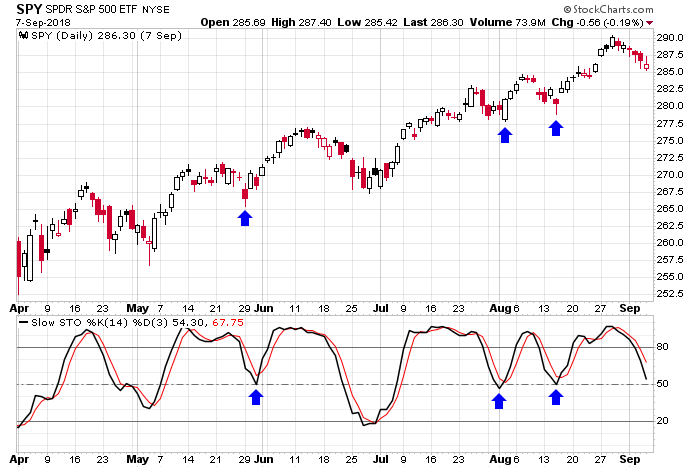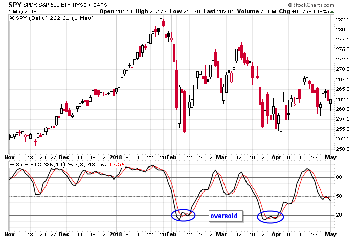 The S&P 500 rallied huge heading into the end of January 2018. The index proceeded to trade up and down in a large range for several months. For traders that use Stochastic, bottoms formed when the indicator rebounded from the oversold levels shown. The market was volatile at the time, so an exact entry was not easily discernible. But at least traders had a framework to work with.