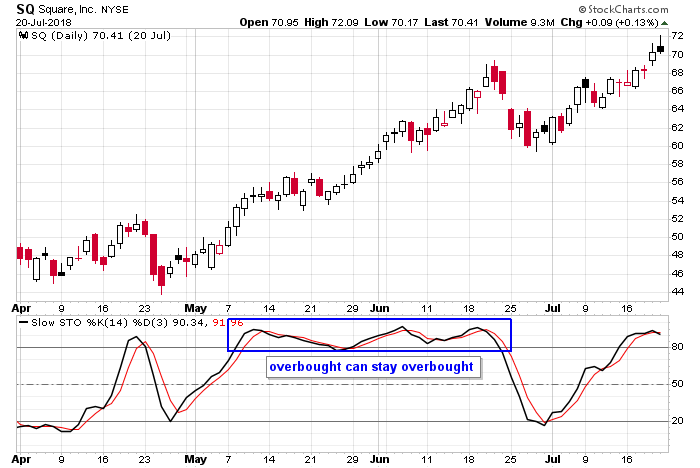 SQ steadily trended up during most of May and June, and once the Stochastic got to an overbought level above 80, it remained there. In this case, the elevated reading confirms the trend and likelihood it will continue.