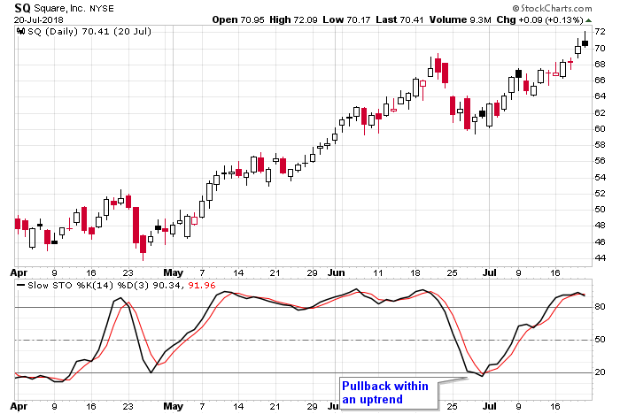 After SQ trended up for two months and its Stochastic sat in overbought territory, the stock dipped while the indicator cycled down to and oversold level at 20. When it turned back up, it classic “dip within an uptrend” was available.