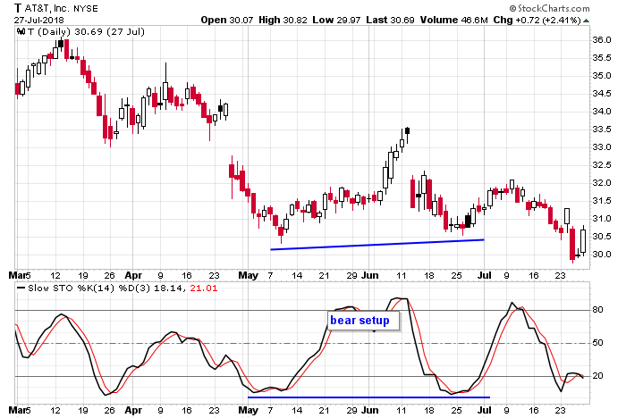 AT&T was trending down when it put in a higher low, but its Stochastic matched a previous low. This told traders the stock wasn’t quite ready to put in a bottom and rally. A bounce followed, but it didn’t go far or last long before the stock rolled over and dropped to take out its low.