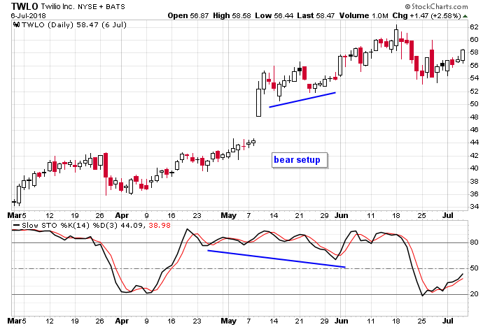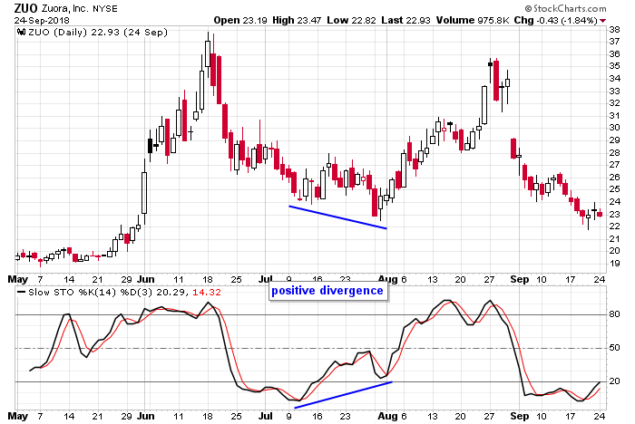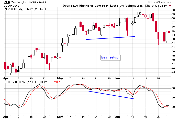 TWLO gapped up and pushed higher while its Stochastic fell out of overbought territory and took out its lows of the previous month. This was a sign the stock’s strength wasn’t entirely supported. ZEN did push higher but eventually came back down to where it was when the divergence formed. Being aware the stock wasn’t likely to go far without coming back down and letting the Stochastic cycle down can help a trader with entries and management.