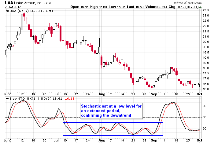 UAA broke a support level in June and then began a downtrend that didn’t end until the Stochastic climbed out of its base. The indicator didn’t stick below 20, but it did roll up and down in a range at a low level. This confirmed the downtrend.