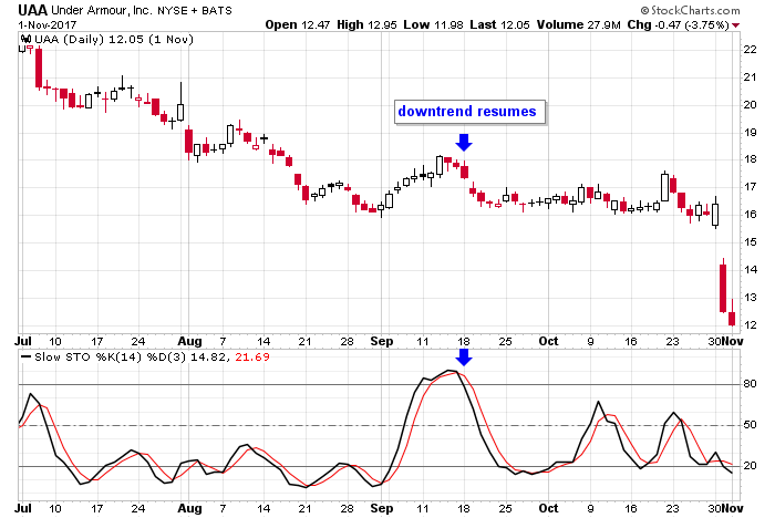 UAA was steadily trending down. The September bounce, which was nothing more than a bounce within a downtrend, offered a good place to initiate a short position.