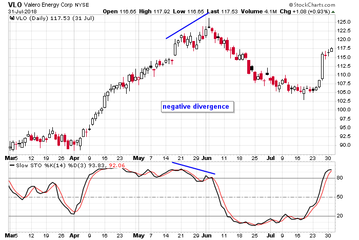 VLO steadily trended up for two months and then rolled over. During this time the Stochastic got into overbought territory and held the reading for about 6 weeks. Given the stock’s strength, despite the negative divergence, a sell signal isn’t given until the indicator moved below 80 and then took out that level (late May) a week later. The negative divergence told traders the stock might be reversing, but it wasn’t until we got confirmation later that a signal to sell a position was offered.