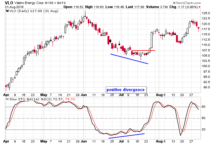 VLO was a strong stock in an uptrend that was in the midst of a temporary pullback when it formed a positive divergence with its Stochastic. As the stock grinded lower in July, the indicator slowly trended up. With the %K line above its %D line and above 20, a buy was signaled when the stock broke out at 107.5.