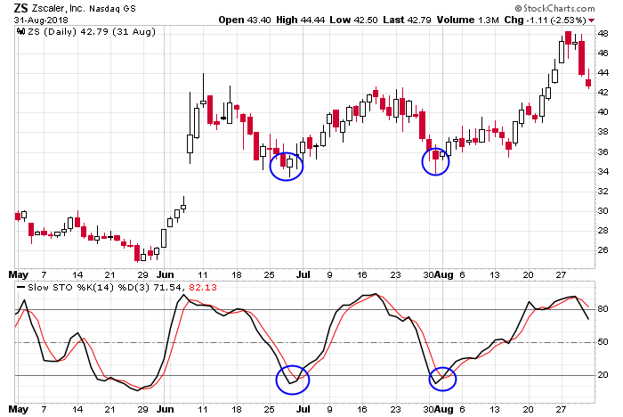 ZS surged in early June, and then while the stock rolled up and down in a range for 2+ months, two oversold Stochastic readings helped traders buy dips within the range.