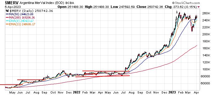 Mexico did incredibly well for about two years off its COVID low. A deep drop last year has been countered by a rally that has almost put the country back at its high. A breakout from the current consolidation seems likely, barring the entire world moving down.