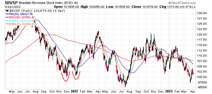 Brazil nearly got cut in half after COVID broke out, so it had a huge hole to dig out of. It topped in June 2021, well before most of the world, and although it put in a higher low last October, it has mostly struggled since.