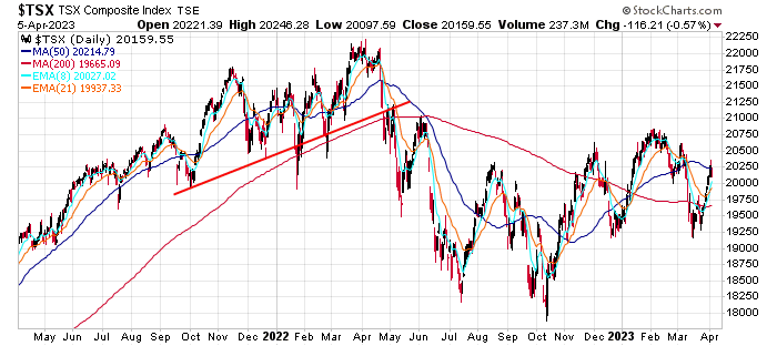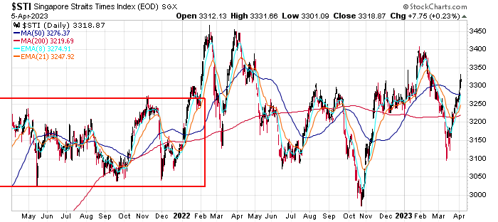 Singapore likes to reverse quickly. Spike highs and lows are everywhere. The October low was well below the June low, but the November and January rallies almost put the stock at a 52-week high. Overall, it’s just chopping around.