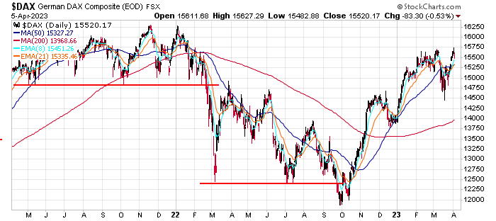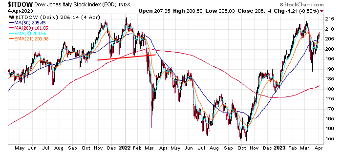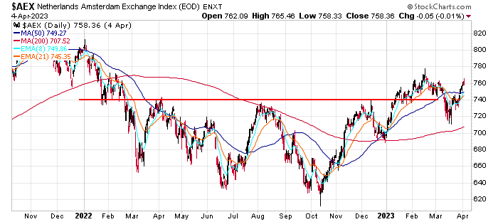 The Netherlands started basing earlier in 2022 while much of Europe continued dropping. Then it rallied to match previous highs before getting support from its 200 in December. A 52-week high was printed in February.
