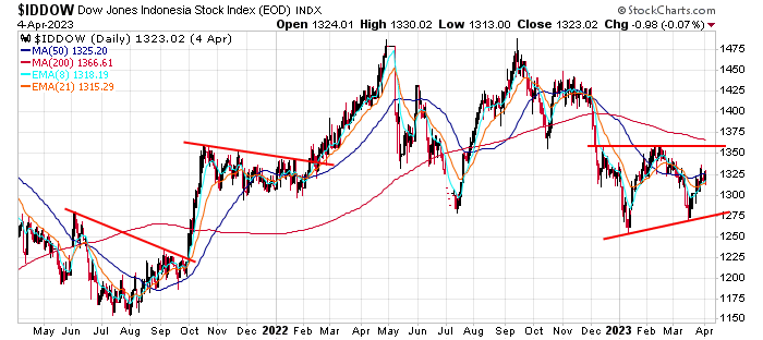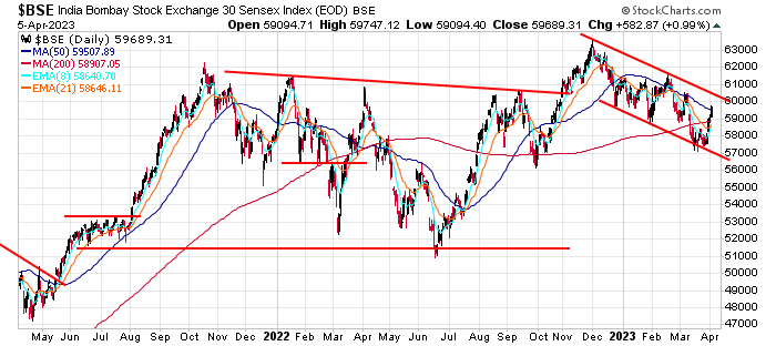 India put in a significantly higher low last fall and then rallied to a 52-week high in November and December. How many markets can say that? But it’s been downhill since then. Maybe this is a falling pattern within an uptrend, or maybe we should just note the index is unchanged over the last 18 months.