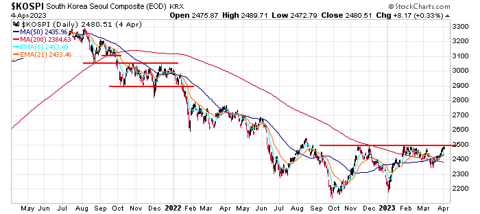 South Korea stayed weaker longer but has been basing since last summer. The downtrend has neutralized. Now it needs a forceful move up to reverse the trend.