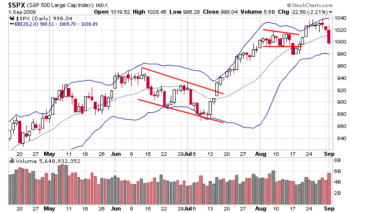 Here’s the daily SPX. Unless the market immediately bounces today, my minimum target is 980 – the bottom Bollinger Band.