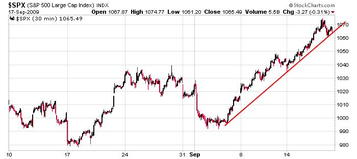 The put open interest once again dominated the call open interest, and here we are near the highs. The bears keep betting on a big move down, and they keep getting burned. When will they learn? Wall St. hasn’t changed in 100 years. When traders/investors are super bullish, it pays to be skeptical. When they’re in panic mode, it pays to look for bargains. Right now there’s no fear. Nobody is worried. Everything is peachy keen. Good times are ahead. Or at least that’s the sentiment. Here’s the SPX 30-min chart. It’s moved about 80 points in just over two weeks. It deserves a break.