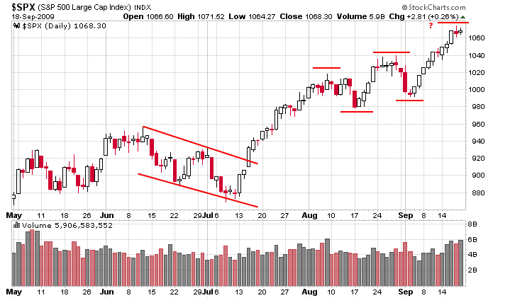 Here’s the SPX daily. You can’t argue with the trend, but you could argue the index is in nosebleed territory and in need of a rest. Last Thursday was a near Doji day – a sign of indecision. Then Friday was an inside day – the high and low were contained within the previous day’s high and low. Such action builds pressure into the market and often results in a trend day.