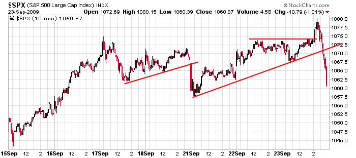 I’d say anything goes today. Here’s the SPX 10-min chart. Early strength could get sold into around 1067.5 or 1072 or early weakness could get bought around 1057.5.