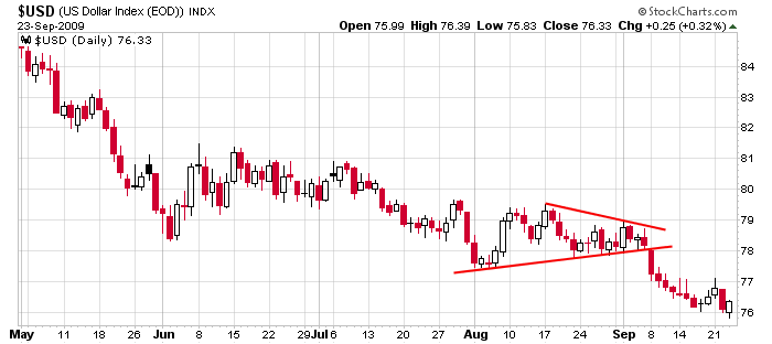 The US dollar formed what might be a reversal candle off a low. The dollar and the market has been inversely correlated, so besides the market itself showing near term topping signs, a move up from the dollar would confirm.
