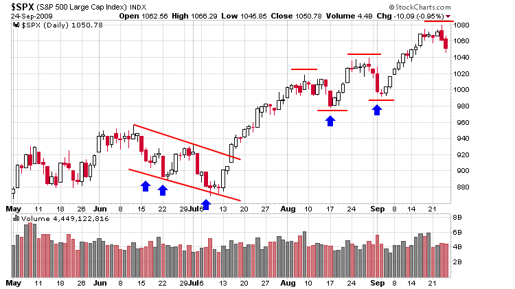 Overall higher highs and higher lows remain in place, and for what it’s worth, volume has been very light this week. Swing traders who trying to ride trends for all their worth can hold stocks with appropriate stops. Shorter term traders should have been out yesterday at the latest. As far as playing the downside, I prefer buying the inverse ETFs. You get less bang for your buck, but there’s also much less risk and very little research time needed.