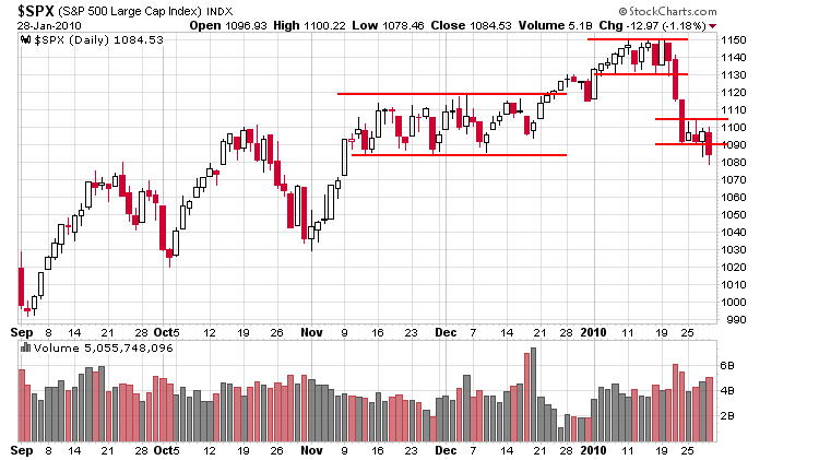 Here’s the SPX daily. Down days carry more volume than up days. If we get follow through to the downside today, the bulls will have one more day to rescue the situation. Otherwise it could be a quick trip to 1030.