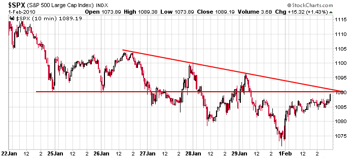 Here’s the 10-min SPX. Lots of up and down movement, very little net change from a week ago. 1090 is resistance. After that the index needs to break this lower highs, lower lows pattern. More after the open.