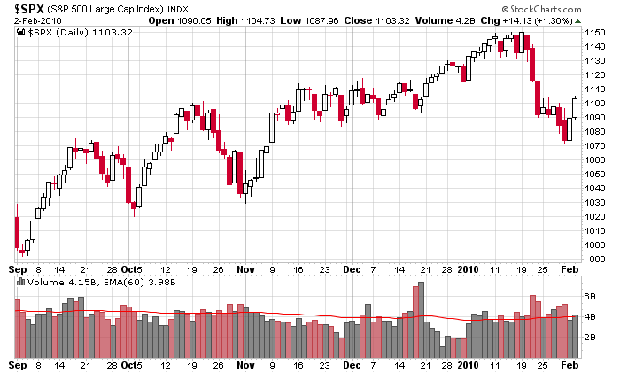 A week’s worth of losses have been recovered (plus some) in two days, but volume has been weak. Under most circumstances, I’d be happy with the market’s performance but a little uncomfortable with the lack of volume and in some cases, lack of leadership. But the last 11 months have been different than most cases. The last 11 months have seen the market turn on a dime and rally without ever resting or retesting it lows. Look at the chart below. The Sept bottom immediately led to 8 of 9 up days. The move off the Oct low was also highlighted by 8 of 9 up days. The Nov low was similar – 10 of 12 up days. During the current uptrend (yes the long term uptrend is still up), once the market turned, it never looked back.