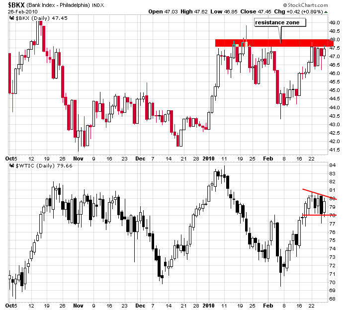 Banks and Crude Oil: These are two charts I’ll be watching next week. They both consolidated last week, and their next move – whether it confirms or contradicts the overall market – will be telling.