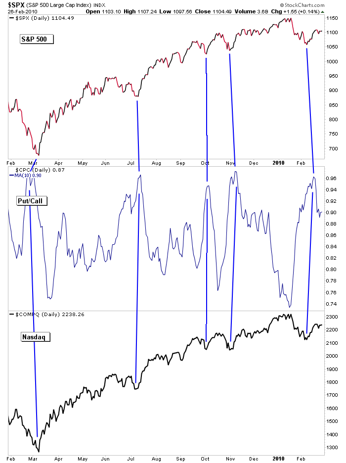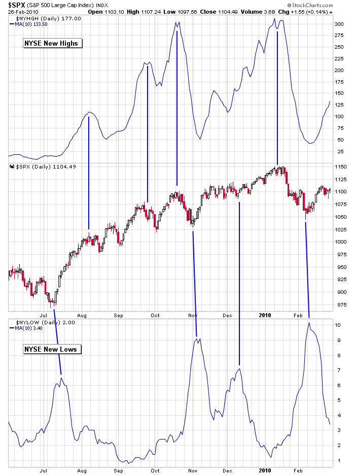 S&P 500 vs. the 10-day MA of NYSE New Highs and New Lows: When new highs rally and then roll over, the market rolls over too. When new lows rally and roll over, the market reverses its correction. Right now we don’t have a spike in either, so we can’t depend on extreme sentiment in one direction or the other helping us determine the market’s most likely next move.