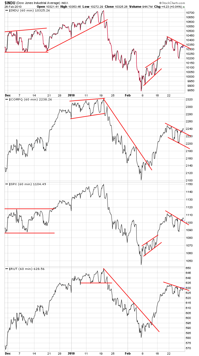 The 60-min Charts: They give a better picture of last week’s movement. In all cases we have falling patterns within short term uptrends. These are bullish, but you can see the rising patterns within the downtrends (Feb 8-16) which did not resolve down. When I stand back and look at these charts, I see indexes trading at approximately the midpoint of their most recent high and low. This is neutral.