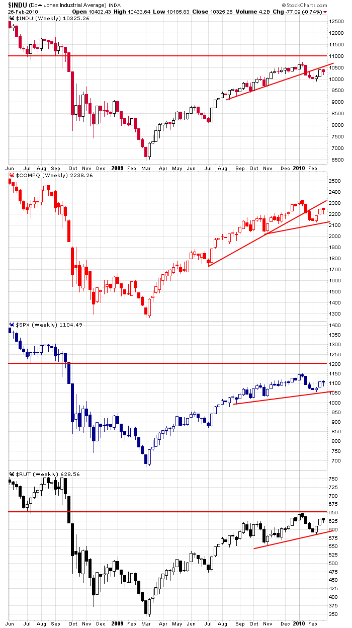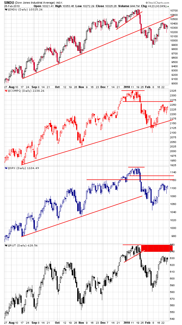The Weeklies: The weeklies weren’t very telling last weekend, and since last week was a below-average range week with very little net change, nothing changed. The Dow may have resistance just above 10.5K; the Nas is sitting between two trendlines; the SPX may have resistance at the recent high, but much stiffer resistance doesn’t come into play until 1200; the Russell will have a tough time with 650. In all, other than the Dow, there is no front-and-center resistance to deal with early next week.