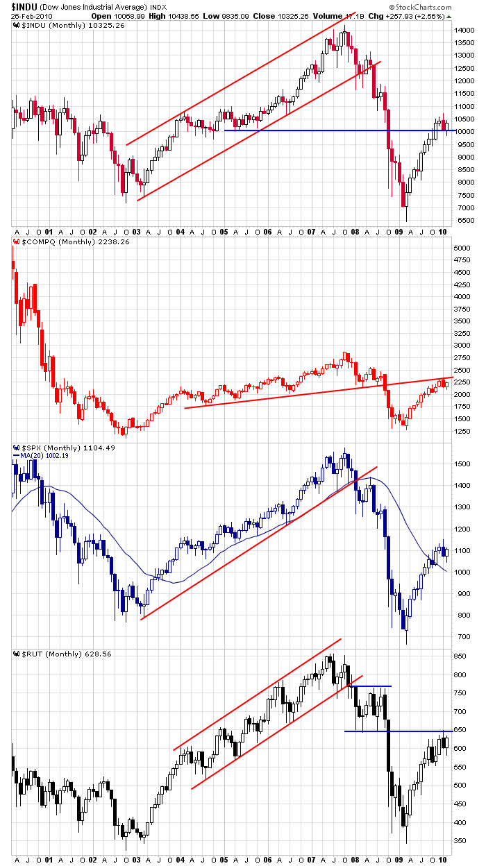 The Monthlies: February is in the books. It was a decent up month – especially considering the first week was very weak. For what it’s worth, the Dow successfully tested 10K, and it doesn’t seem to have much resistance until 11K. But the Nas and Russell are both under trendlines that have proven tough to conquer. The move off the Mar low is steep; 10 of 12 up months will be tough to build on; how much longer can it last?