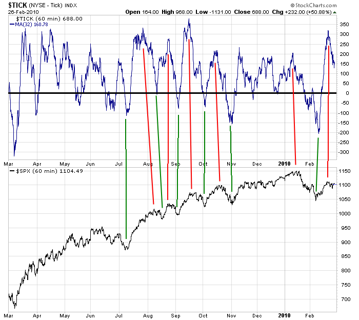 S&P 500 vs. 32-MA of TICK: This indicator suggests we have some downside or at the very least, more sideways trading to work off an overbought condition. When the 32-MA of the TICK on the 60-min chart reaches an elevated level as shown and rolls over, the market tends to correct temporarily.