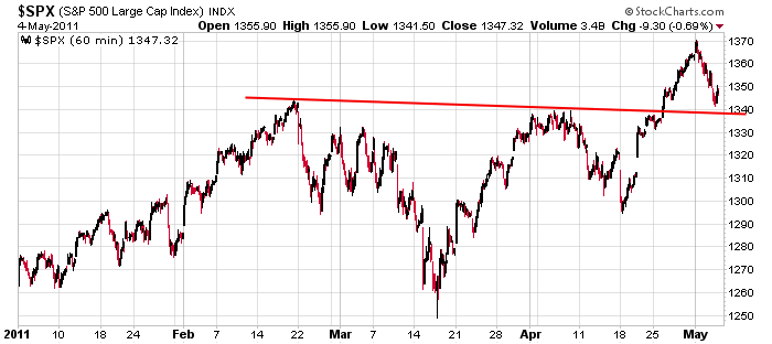 Here’s the 60-min S&P chart. There’s nothing hugely wrong with it. We got a clean breakout near 1340, a rally to 1370 and now a pullback to test the previous resistance level. I’m a shorter term trader, so Monday’s gap up and selling pressure was enough to get me out of my longs, but if you’re a longer term trader who is willing and able to sit through some pain in exchange for being positioned to nail some bigger moves, you could justtify holding here…but only if you’re a longer term trader.