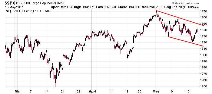 The market bounced nicely yesterday, albeit on lightish volume. I stated yesterday morning my upside S&P targets were 1330 and the high 1340’s, and for now I’m sticking with those. 1330 was easily taken out yesterday, so 1350ish is next on my radar. Here’s the 30-min chart.