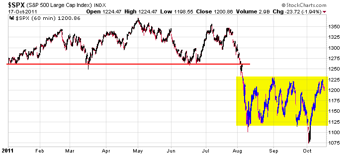 During the 2-week rally, we got across-the-board improvement. The small caps had some days where they led. The heavily-weighted Nas 100 stocks did great – AAPL, AMZN, GOOG went on huge runs. The internals greatly improved. The market brushed off some negative news. It seemed like a step in the up direction, and barring bad news from Europe (or a lack of good news) I think a pullback gets bought. But this of course is a big IF. We have no control over what Europe does (or doesn’t do) or says, so although I lean to the upside right now, I am willing to abandon my view very quickly if the movement necessitates it.