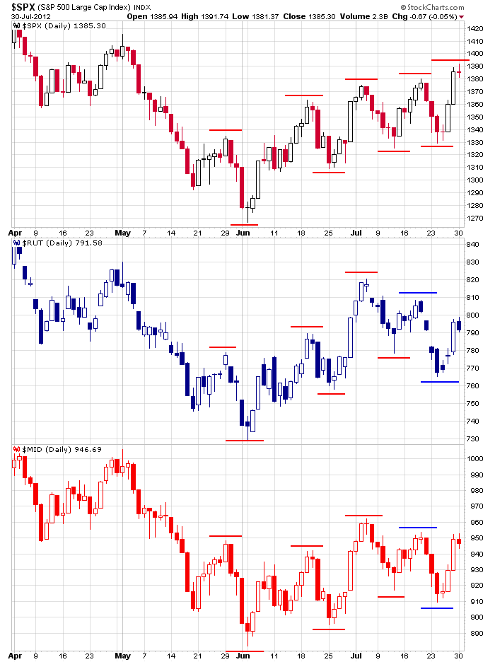 Thanks to two huge up days last Thursday and Friday, the bulls are breathing again. The move has given the bulls a cushion to work with (they have room for error, not every piece of news is live or die), but from a technical standpoint, one big divergence remains in place. That’s the progress of the large caps vs. the small and mid caps. When the market is healthy, when investors are confident, they buy more speculative stocks which have the potential to rally several hundred percent, not the rock-solid old-school companies which serve as safe-havens. So far, this isn’t happening. Recently, when the large caps made a higher high, the small and mid caps failed to match the move. This condition must be negated or there will be limited further upside. Here’s a chart of the S&P 500, Russell 2000 and S&P 400.