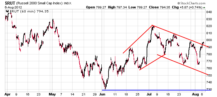 Here’s the equivalent Russell 2000 chart. It’s definitely a concern the small caps have been making lower highs and lower lows while the large caps have trended up. Last week $RUT made a higher low, and now it’s close to a higher high. It’s a needed step. This divergence needs to be negated if the market is going to sustain a rally. We need to see evidence traders/investors are willing to take on a little risk. A market that sees most of the money flowing into large cap safe havens will not stand. More after the open.