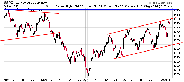 Depending on how you draw you trendlines, it could be argued the S&P is near resistance. The red trendlines in the following 60-min chart are parallel, and they capture all the movement from the last two months. “Containing” and “describing” the price movement increases the odds they are significant. I like the overall action, although the personality of the index (5 steps forward, 4 steps back, lots of sudden reversals, lots of gaps) has made swing trading challenging.