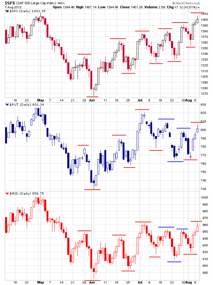 This is good. It enables us to focus on the US market which has made good progress recently. I’ve beening talking about the divergence between the large caps, small caps and mid caps for several weeks. Divergences can last in the near term but some simply cannot persist if the market is to move up. This is one of those. I need evidence investors are willing to take on a little risk by buying into small caps and mid caps rather than just putting their money in large cap safe havens. For several weeks, the large caps made higher highs and higher lows, but the small and mid caps were not able to match the movement, until now. Last week they made higher lows for the first time in three weeks, and yesterday they made a higher high. Overall the indexes are mostly neutral because they are little changed over the last couple months, but this recent development is a positive sign.