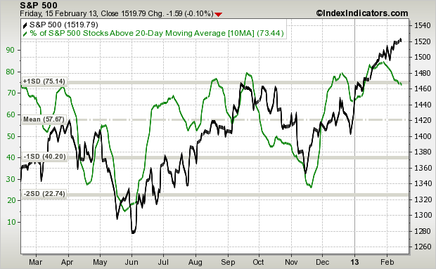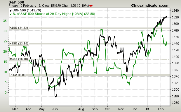 We enter this new week with the S&P on a 7-week winning streak, but volume is falling off and a couple short term indicators are suggesting some near term weakness is in order to allow the charts and indicators to reset. Specifically, the % of S&P stocks trading at a new 20-day high and the % of S&P stocks trading above their 20-day MAs has been declining for two weeks. Mathematically this can persist in the near term, but over time it’s impossible to maintain. Either the market will come down – just in the near term – or the indicators need to reverse. Here are the charts with the indicators smoothed with a 10-day MA.
